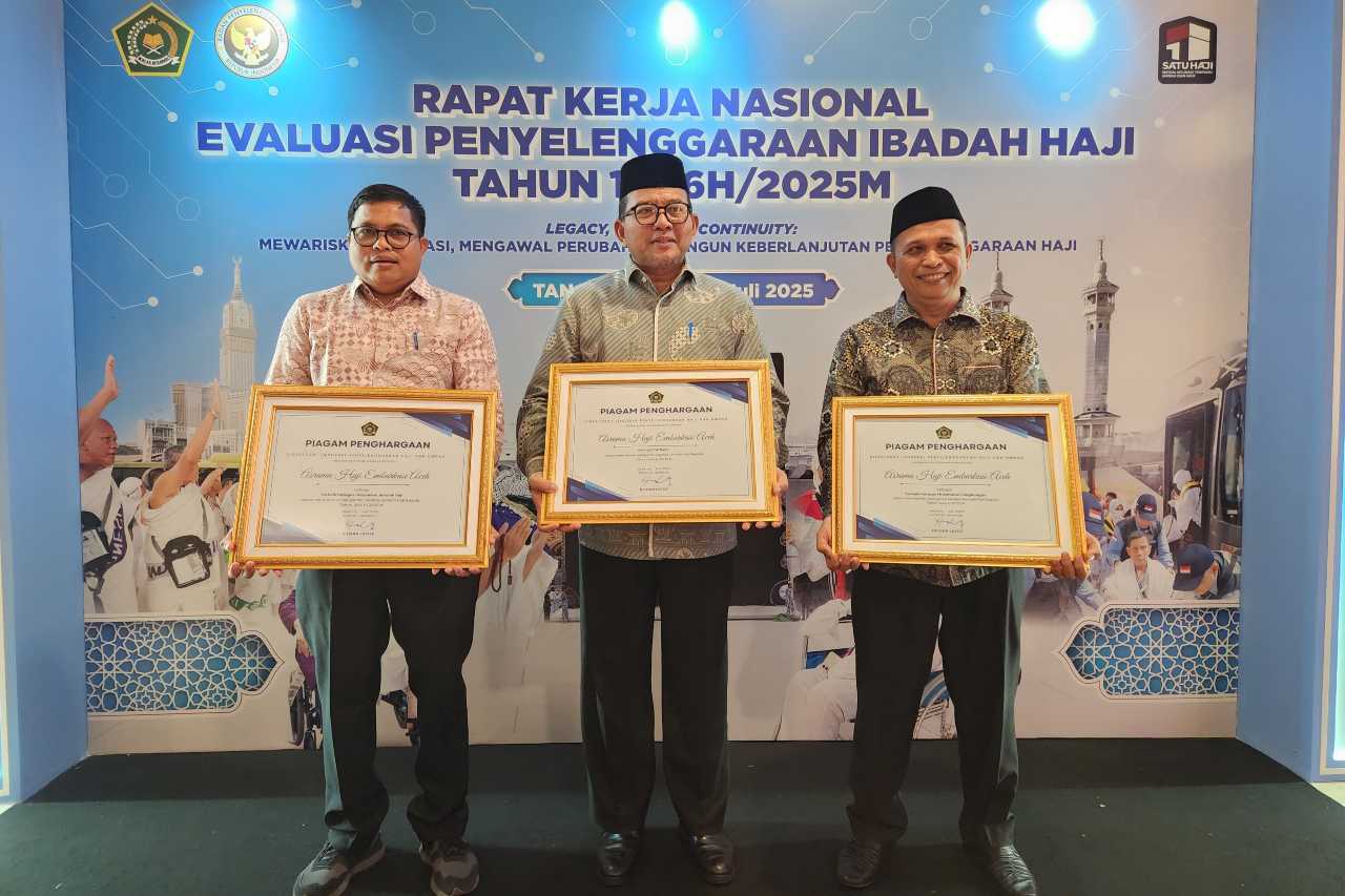 Penghargaan tersebut diserahkan langsung oleh Direktur Jenderal Penyelenggaraan Haji dan Umrah, Prof. H. Hilman Latief, M.A., Ph.D., kepada Plt. Kepala UPT Asrama Haji Embarkasi Aceh, Irsyadi, SE. M.Si., dalam kegiatan Rapat Kerja Nasional Evaluasi Penyelenggaraan Ibadah Haji 1446 H/2025 M di Atria Gading, Serpong, Tangerang, Senin (28/7/2025).