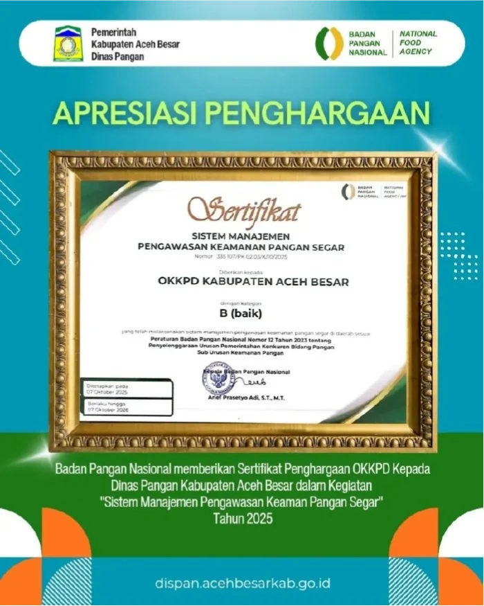 Penghargaan tersebut diberikan kepada Otoritas Kompeten Keamanan Pangan Daerah (OKKPD) Kabupaten Aceh Besar dengan kategori B (baik). Sertifikat bernomor 335 107/PK 02.03/K/10/2025 itu menjadi bentuk pengakuan atas kinerja daerah dalam menjalankan sistem pengawasan keamanan pangan segar secara optimal.