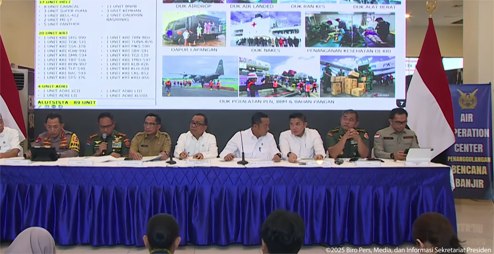Para menteri dan pejabat terkait menyampaikan keterangannya dalam konferensi pers yang digelar di Posko Terpadu Pangkalan TNI AU Halim Perdanakusuma, Jakarta, Senin, 29 Desember 2025. Foto: Yutube, Ditjen Komunikasi Publik dan Media