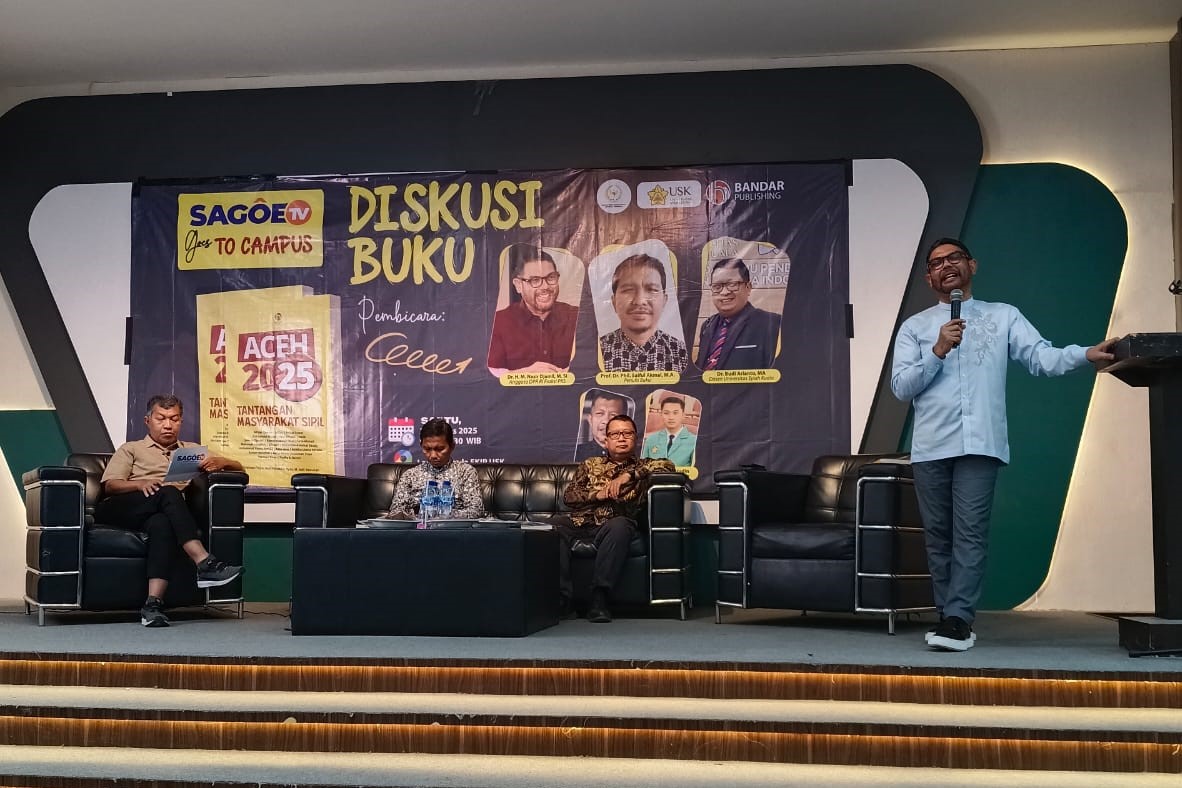 SAGOE TV | BANDA ACEH – Dalam rangka mendorong budaya literasi di kalangan generasi muda, Sagoe TV menggelar program Goes to Campus yang perdana di Aula FKIP Universitas Syiah Kuala (USK), Darussalam, Kota Banda Aceh, Sabtu (2/8/2025). Kegiatan ini dikemas dalam bentuk diskusi buku berjudul Aceh 2025: Tantangan Masyarakat Sipil yang dihadiri seratusan mahasiswa.