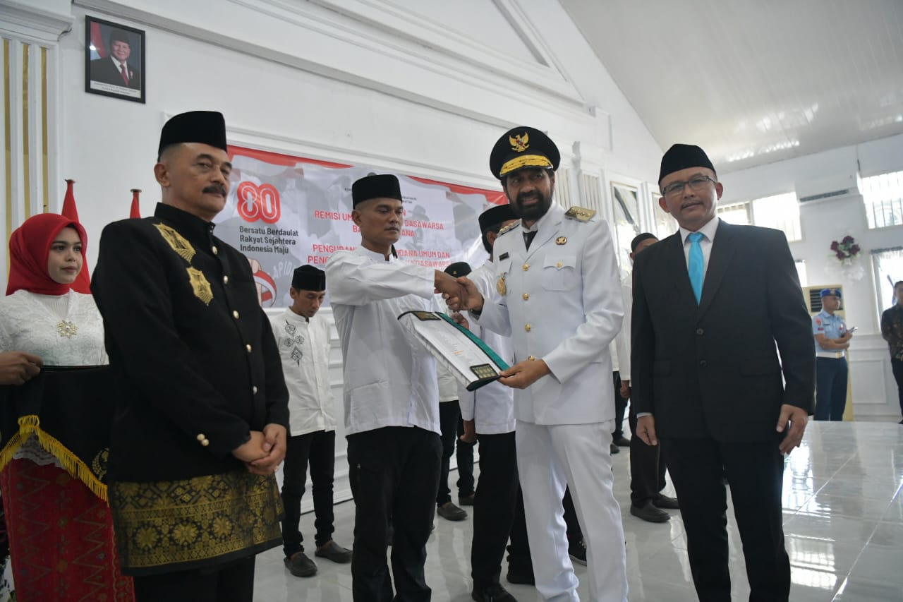 Gubernur Aceh, Muzakir Manaf (Mualem), secara simbolis menyerahkan langsung surat keputusan remisi kepada perwakilan narapidana dalam rangka peringatan HUT ke-80 Kemerdekaan RI yang dipusatkan di Lembaga Pemasyarakatan (Lapas) Kelas IIA Banda Aceh.