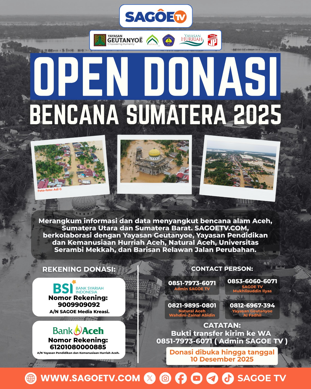 BANDA ACEH – SAGOETV berkolaborasi dengan Yayasan Geutanyoe, Yayasan Pendidikan dan Kemanusiaan Hurriah Aceh, Natural Aceh, Universitas Serambi Mekkah dan Barisan Relawan Jalan Perubahan. Membuka open donasi “Bencana Sumatera 2025” terbatas sampai tanggal 10 Desember 2025, melalui Bank Syariah Indonesia. Nomor Rekening; 9009909092. Atas nama; SAGOE Media Kreasi. Bank Aceh Syariah. Nomor Rekening; 61201080000885. Atas Nama; Yayasan Pendidikan Hurriah Aceh. Bukti transfer kirim ke WA; 0851-7973-6071 (admin sagoetv). Penanggungjawab Program – Mukhlisuddin Ilyas.