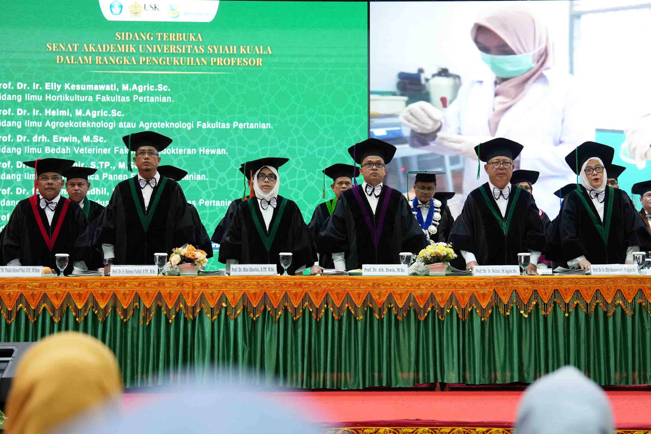 Pengukuhan keenam profesor baru tersebut dipimpin oleh Ketua Senat Akademik Universitas Syiah Kuala (USK), Prof. Abubakar. Adapun keenam guru besar yang dikukuhkan pada hari ini adalah Prof. Dr. Ir. Elly Kesumawati, M.Agric.Sc, Prof. Dr. Ir. Helmi, M.Agric.Sc, Prof. Dr. drh. Erwin, M.Sc, Prof. Dr. Rita Khathir, S.TP., M.Sc, Prof. Dr. Ir. Rahmat Fadhil, S.TP., M.Sc dan Prof. Dr. Teuku Ahmad Yani, S.H., M.Hum.